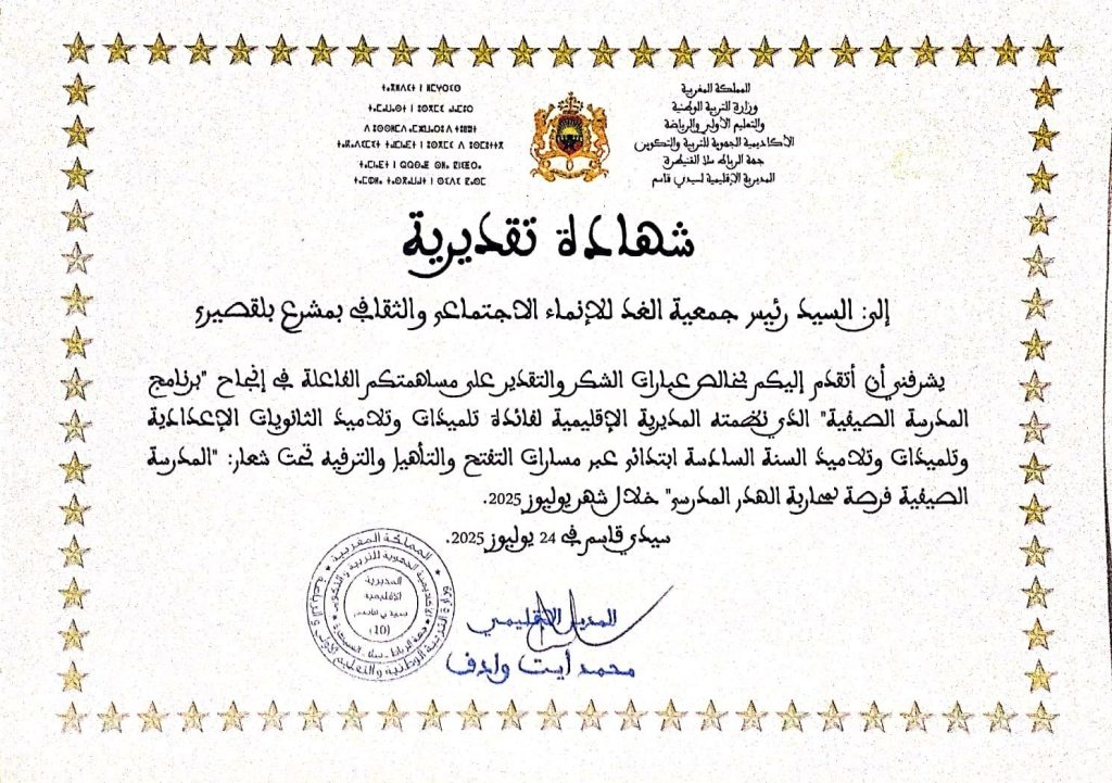 إن هذه الشهادة التقديرية التي نلناها بمناسبة مشاركتنا في إنجاح برنامج “المدرسة الصيفية”، تمثل لنا وسام اعتراف وشهادة تقدير لكل ما نبذله من مجهودات خدمةً لأبنائنا التلاميذ ودعماً لمسارهم الدراسي والتربوي.