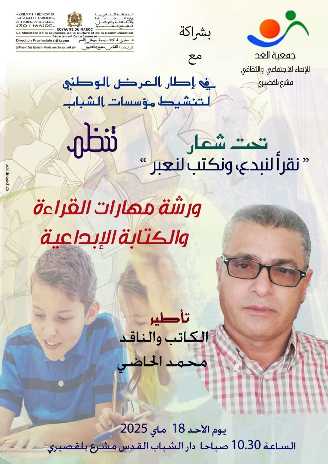 ورشة “مهارات القراءة والكتابة الابداعية ” تحت شعار “نقرأ لنبدع، ونكتب لنعبر ” من تأطير الكاتب والناقد محمد الحاضي صبيحة الأحد 18 ماي 2025 بدار الشباب القدس مشرع بلقصيري