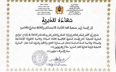 إن هذه الشهادة التقديرية التي نلناها بمناسبة مشاركتنا في إنجاح برنامج “المدرسة الصيفية”، تمثل لنا وسام اعتراف وشهادة تقدير لكل ما نبذله من مجهودات خدمةً لأبنائنا التلاميذ ودعماً لمسارهم الدراسي والتربوي. إننا في جمعية الغد نؤمن بقوة الشراكة بين المجتمع المدني والمؤسسات التعليمية، وسنظل دائماً حاضرين وفاعلين في كل المبادرات التربوية والثقافية والاجتماعية التي تسعى…